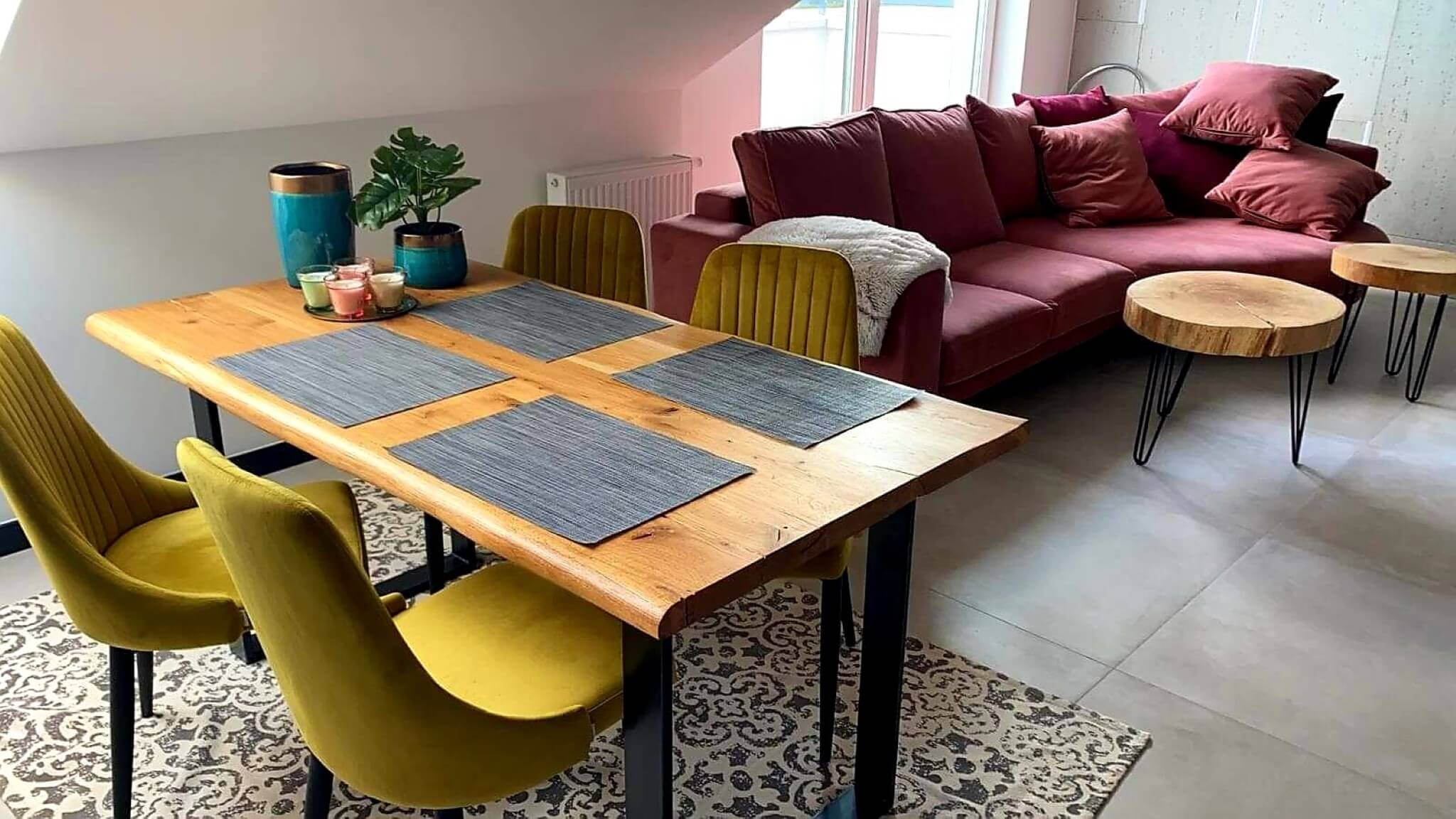Projekt aranżacji wnętrza 3-pokojowego mieszkania w inwestycji Angielska Grobla w samym sercu Gdańska. Ze względu na charakter, jaki panuje na Starym Mieście w Gdańsku, a także na specyfikę samego mieszkania, które znajduje się na poddaszu i wyposażone jest w skosy, zdecydowaliśmy się wprowadzić tutaj styl loftowy. Dominuje tutaj beton, drewno i elementy czerni, ale także kolorowe akcenty, np. różowa kanapa, fotel w odcieniu butelkowej zieleni czy żółte krzesła. Żeby wywołać efekt "wow" już na wejściu, cały przedpokój zabudowany jest na wymiar płytą drewnopodobną, w której ukryte są drzwi, a także profile ledowe, które dają delikatne, acz efektowne światło. Całości dopełniają tapety niezawodnej marki Wonderwall.
