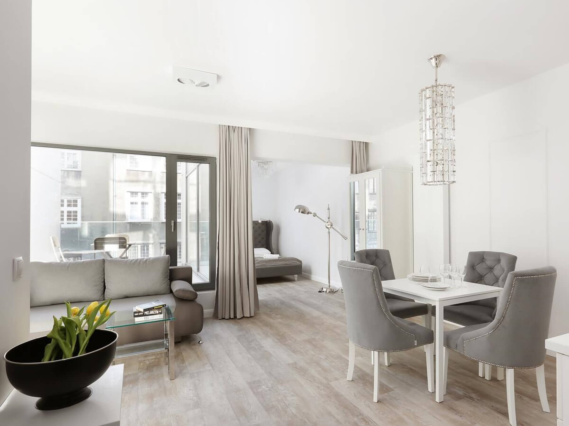 Projekt aranżacji wnętrza niewielkiego mieszkania na wynajem w samym sercu Gdańskiej Starówki. Projekt utrzymaliśmy w stylistyce glamour, ponieważ wiemy, że doskonale wypoczywa się w takich wnętrzach. Jasna, ciepła kolorystyka, tapicerowane meble oraz duża ilość tekstyliów sprawiają, że apartament wizualnie zyskuje większą przestrzeń, a jednocześnie jest przytulny.