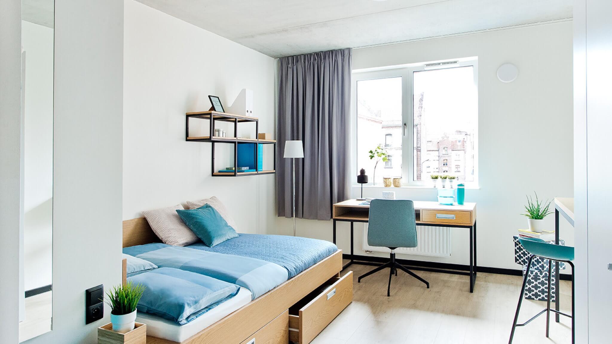 W Gdańsku, przy ulicy Robotniczej, niedawno powstał budynek, który w 100% odpowiada oczekiwaniom współczesnych studentów. Oferuje im bogato wyposażone pokoje, prywatne łazienki oraz aneksy kuchenne, a także rozbudowane części wspólne, gdzie znajduje się m.in. siłownia, pokój do nauki, wspólna jadalnia. W zeszłoroczne wakacje miałam okazję pracować przy projekcie aranżacji wnętrz tego obiektu. Wnętrza miały być nowoczesne i odpowiadające potrzebom młodzieży, ale także przytulne i domowe. Efekt ten uzyskaliśmy poprzez połączenie ciepłego drewna, ale także dużej ilości czerni i turkusu. Efekt końcowy zachwycił nas wszystkich.