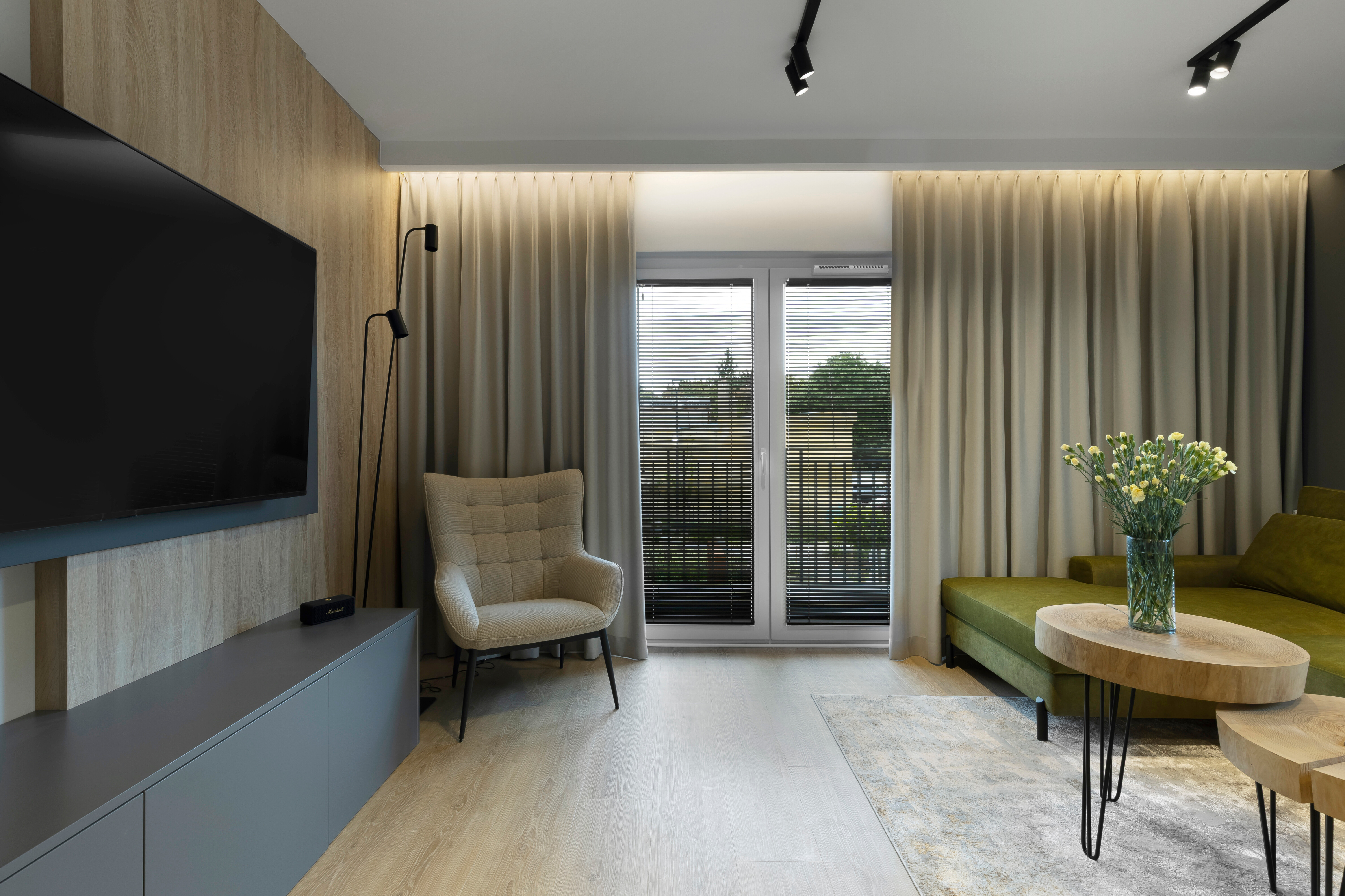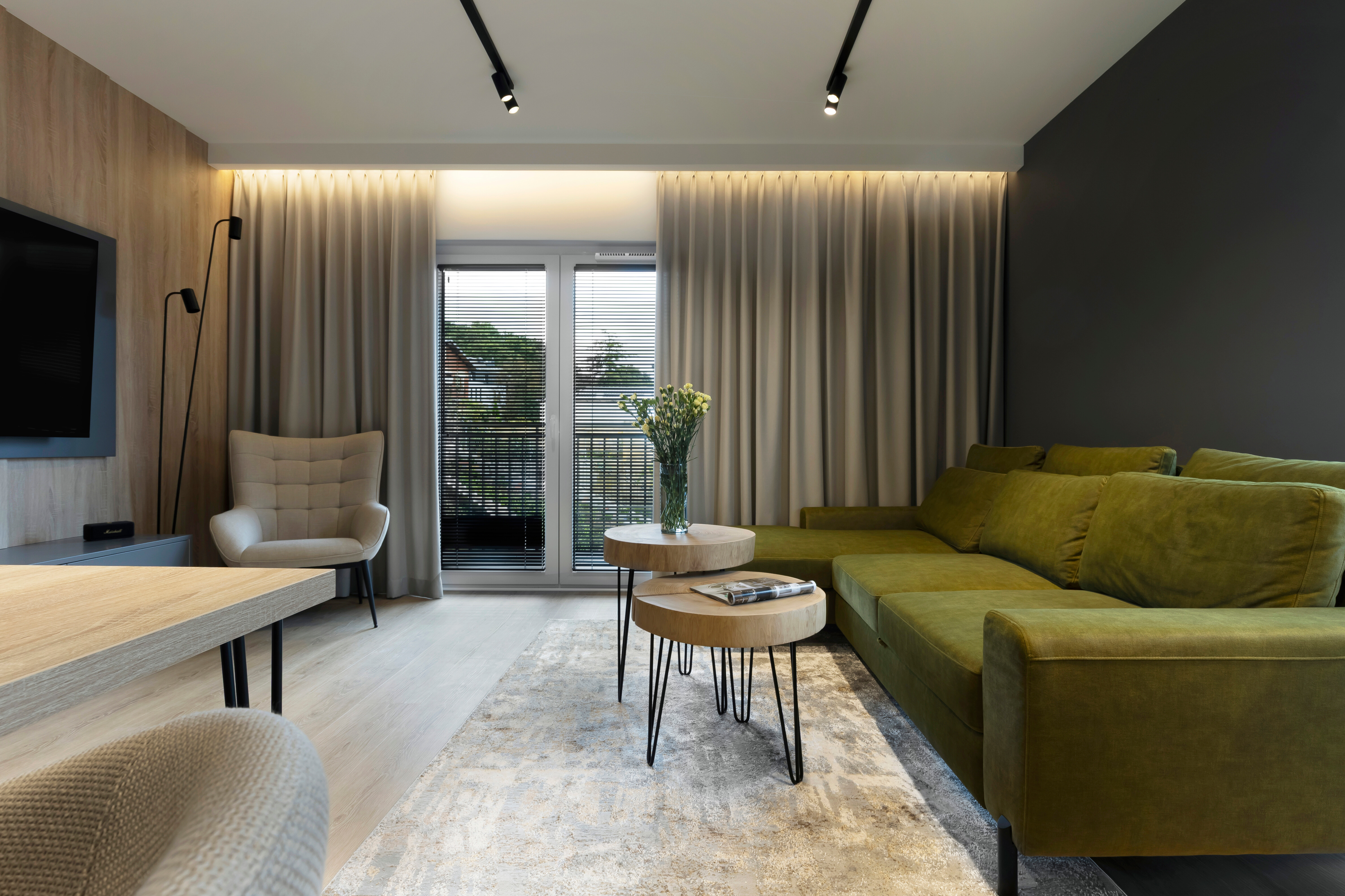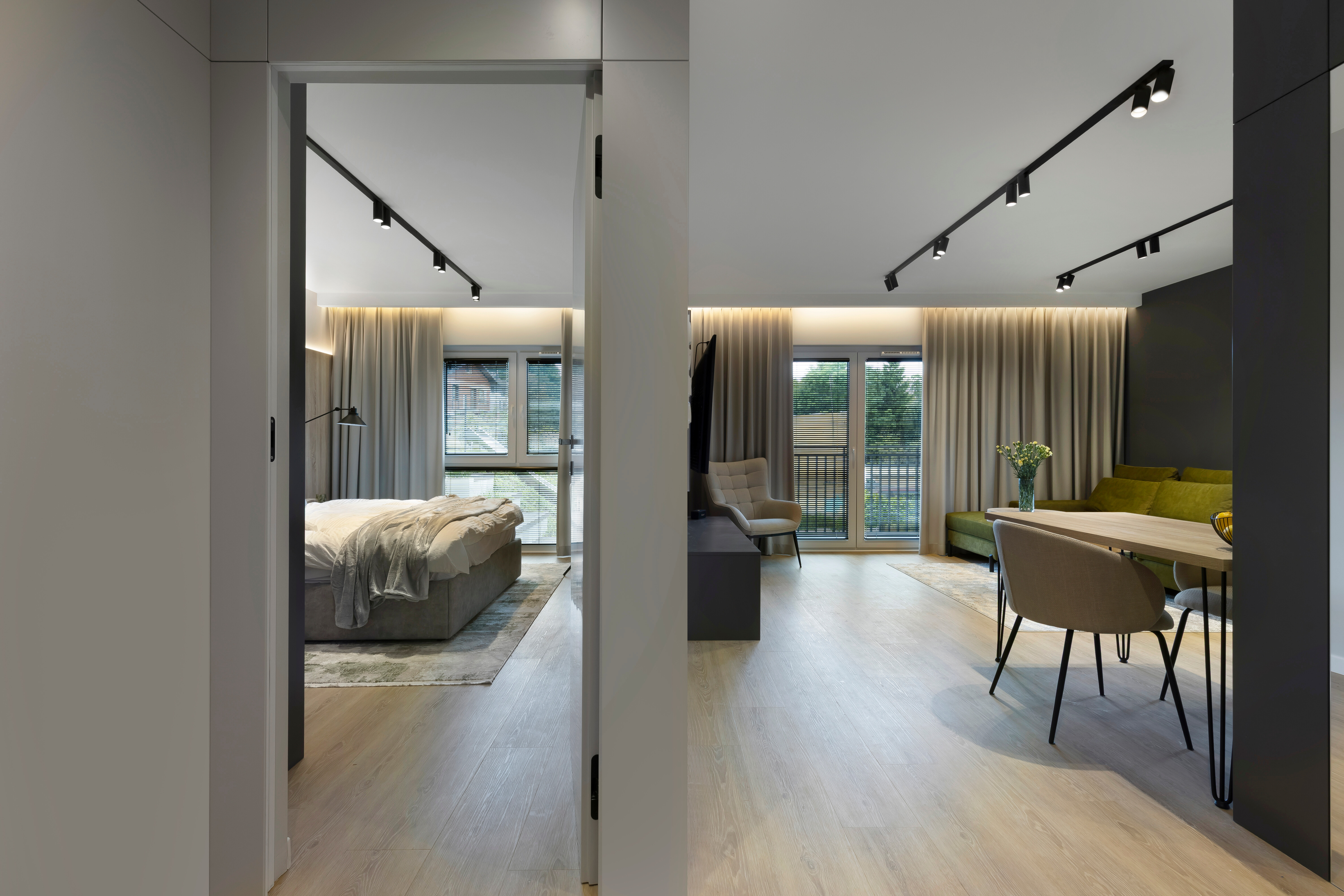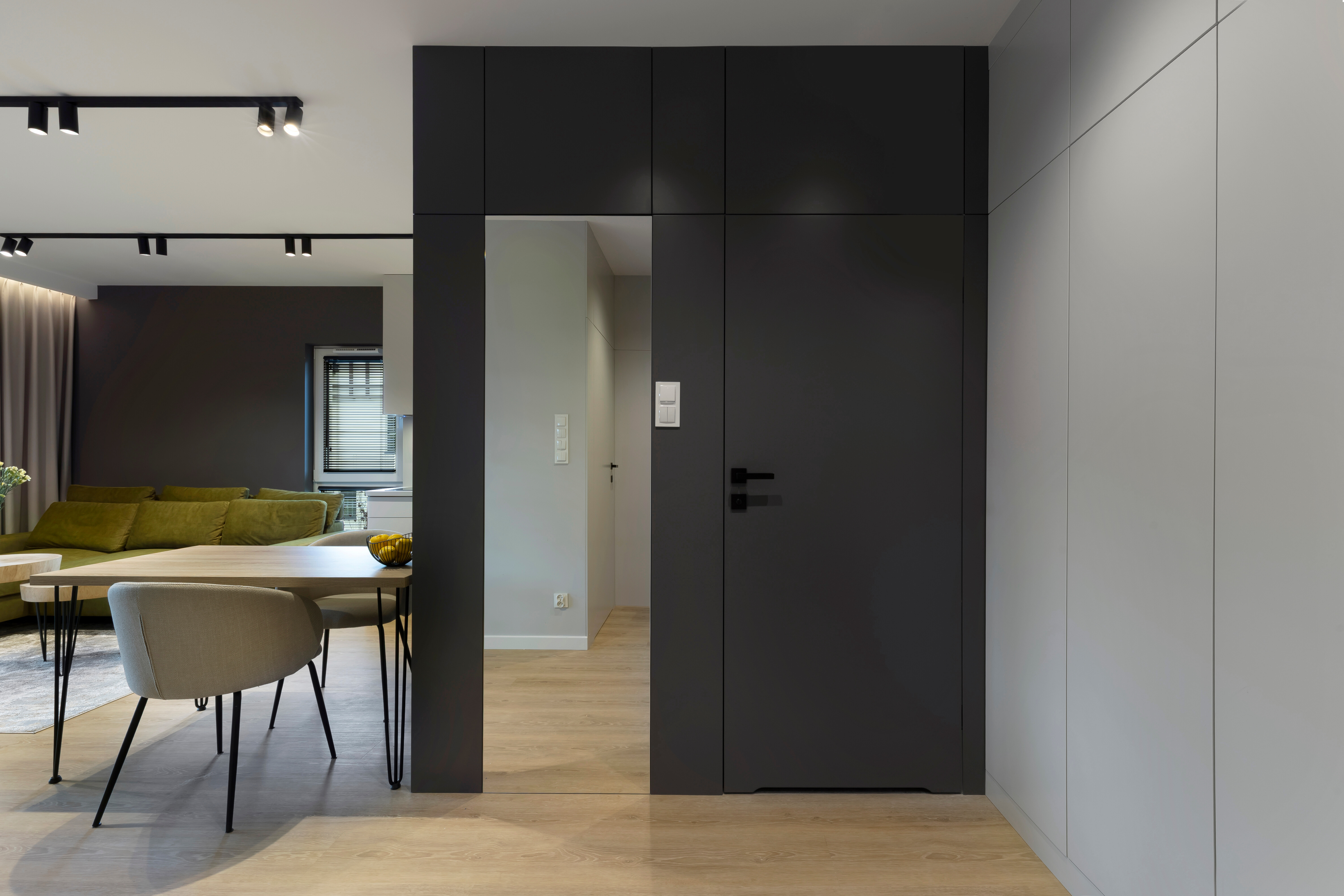 To już piąty projekt dla tych samych Inwestorów! Piąty, z czego każdy był w zupełnie innym stylu... :) Tu postawiliśmy na nowoczesność, ale także przytulność. Całe wnętrze jest monochromatyczne i utrzymane w stonowanych barwach: bieli, szarości, czerni, delikatnych beżów. Pojawia się tu jednak swoisty akcent, jakim jest... oliwkowa kanapa! Taka kolorystyka była marzeniem Inwestorki, które w końcu udało nam się spełnić. Jako, że jest ona dość mocnym elementem,