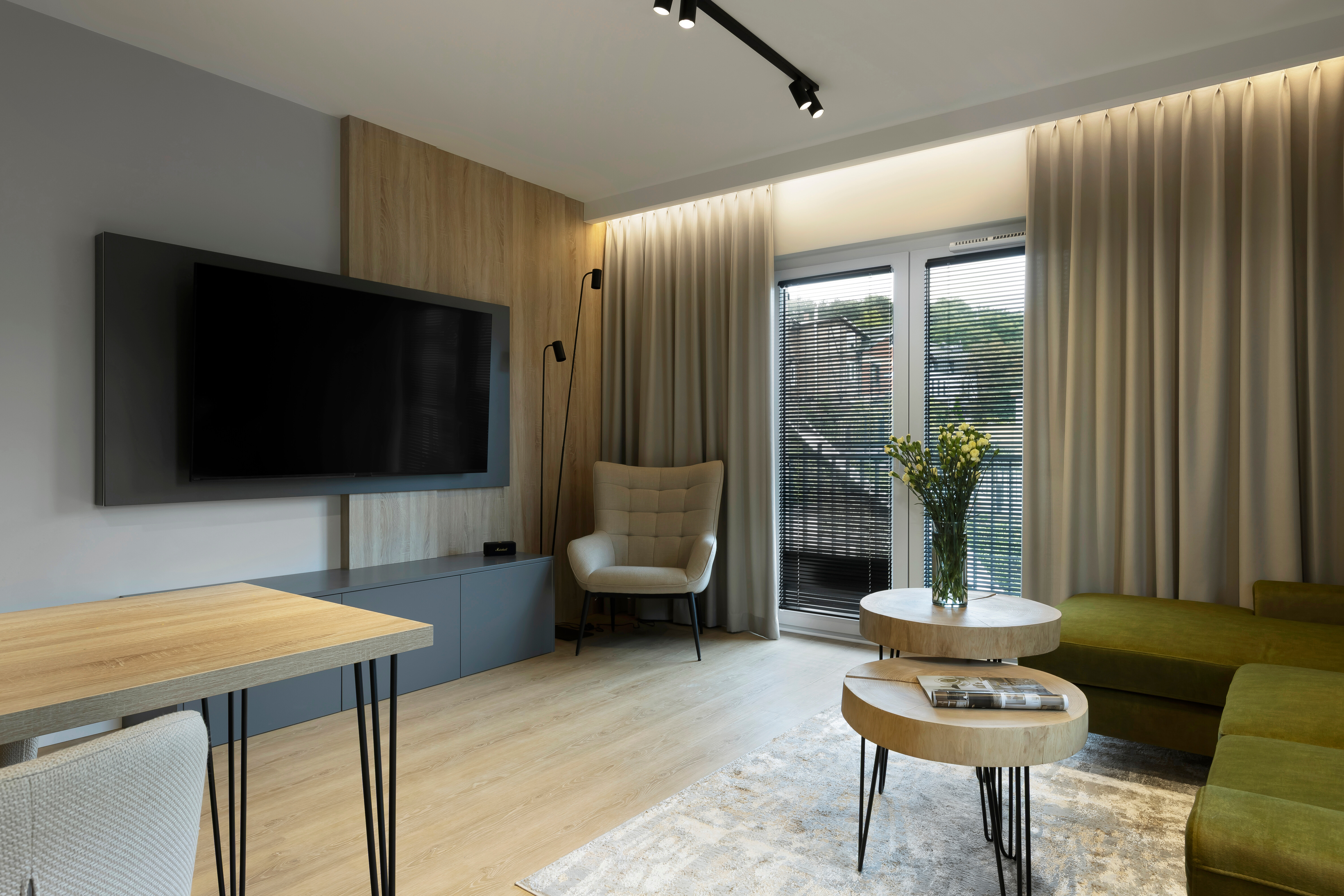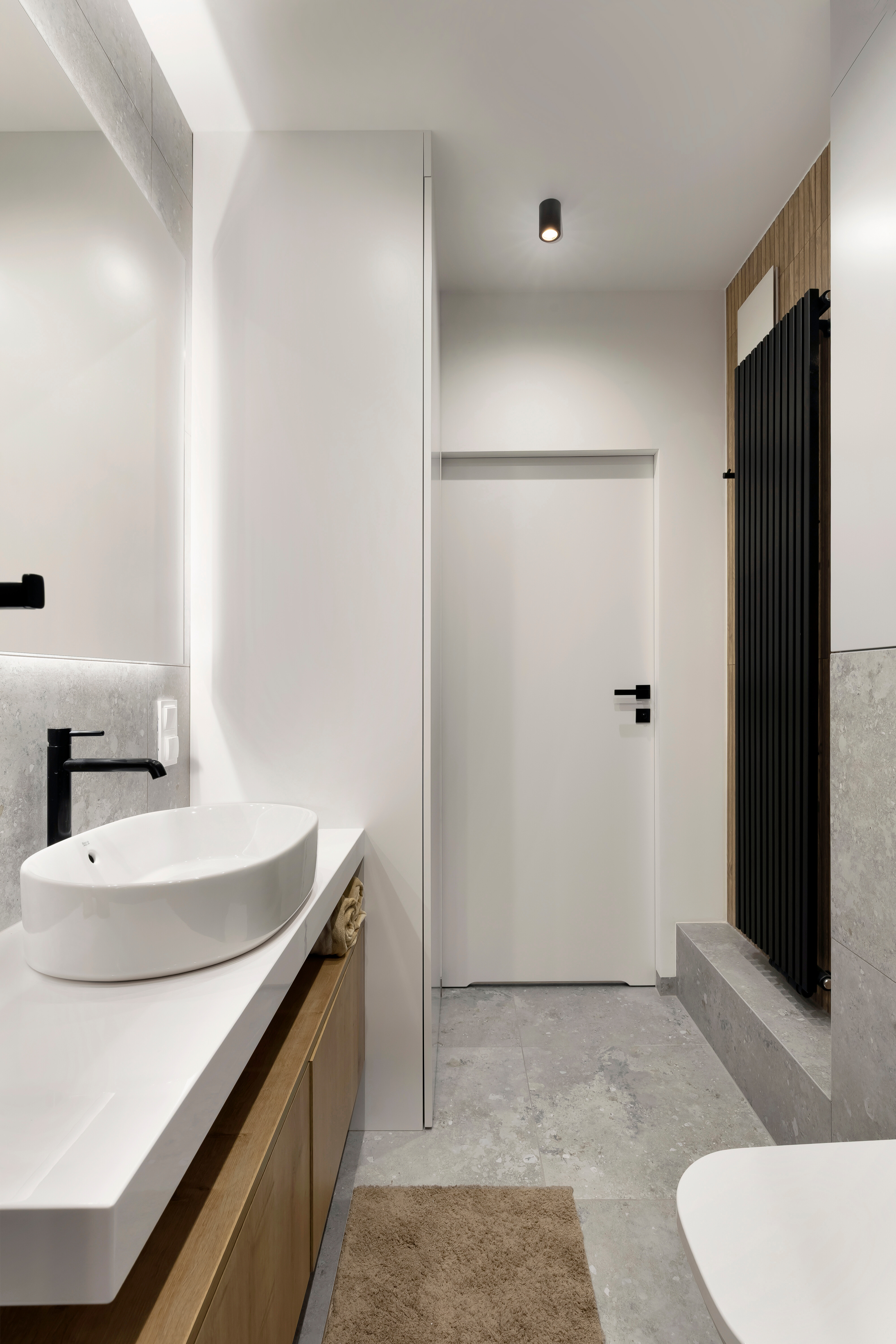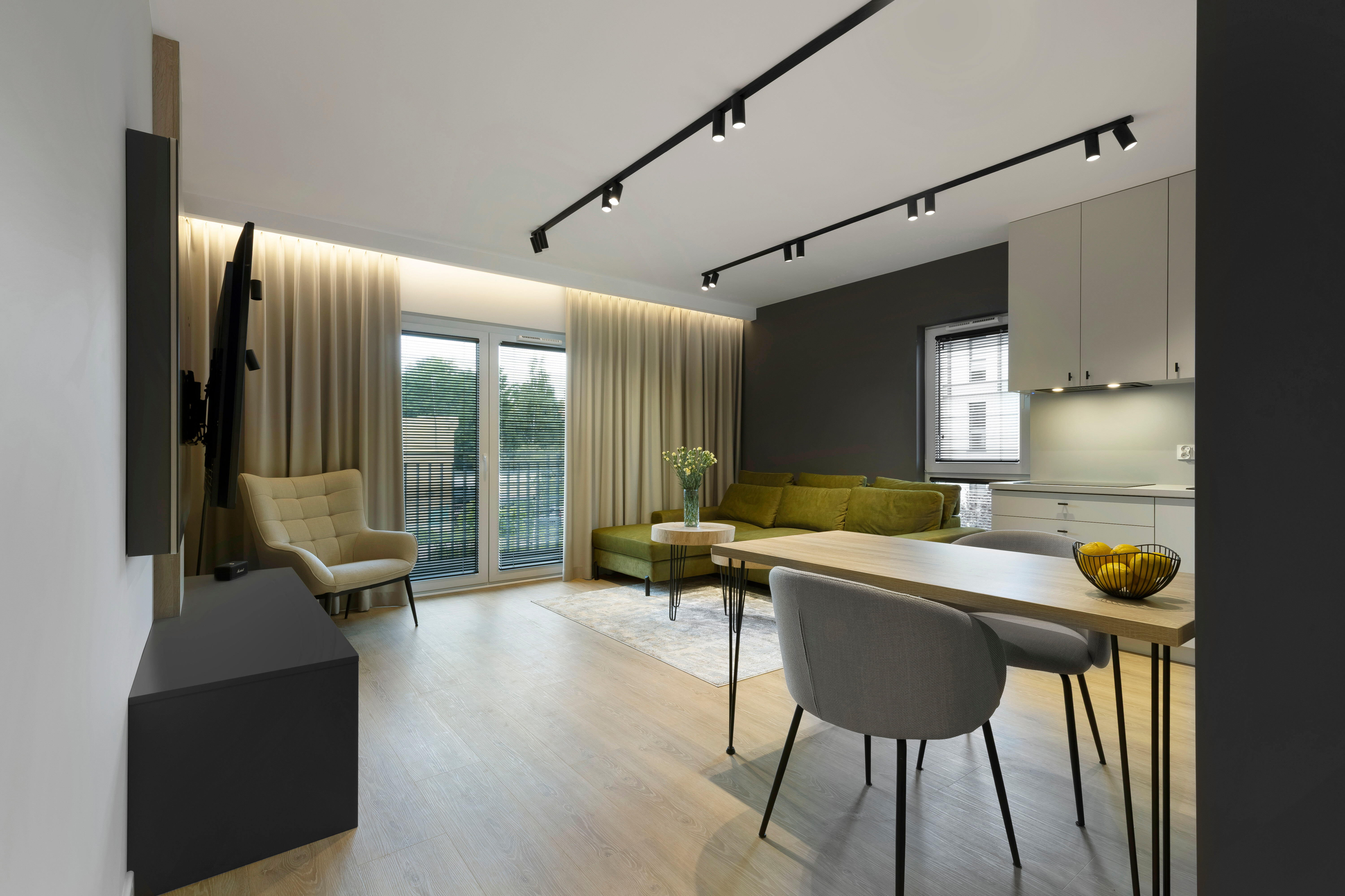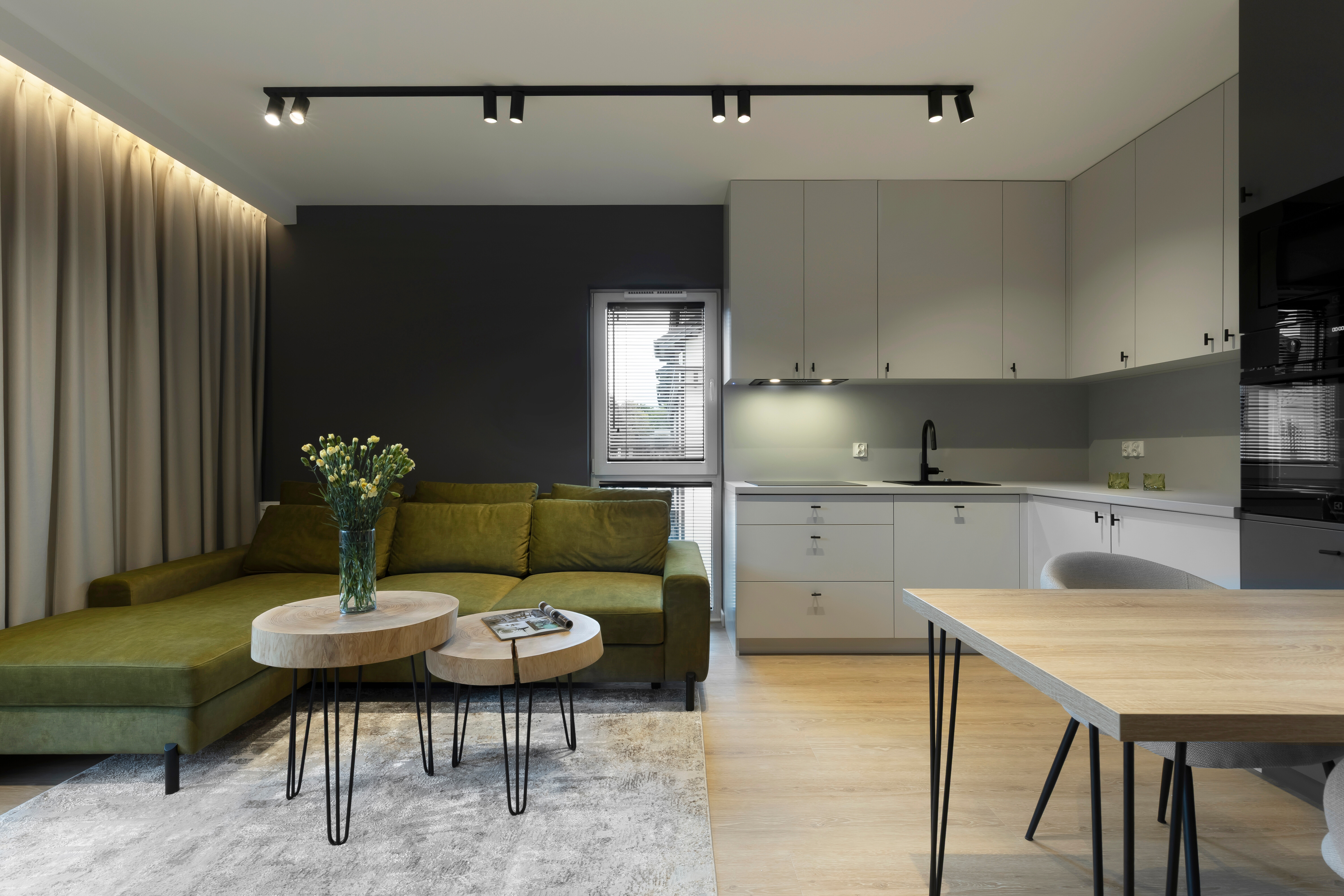To już piąty projekt dla tych samych Inwestorów! Piąty, z czego każdy był w zupełnie innym stylu... :) Tu postawiliśmy na nowoczesność, ale także przytulność. Całe wnętrze jest monochromatyczne i utrzymane w stonowanych barwach: bieli, szarości, czerni, delikatnych beżów. Pojawia się tu jednak swoisty akcent, jakim jest... oliwkowa kanapa! Taka kolorystyka była marzeniem Inwestorki, które w końcu udało nam się spełnić. Jako, że jest ona dość mocnym elementem,