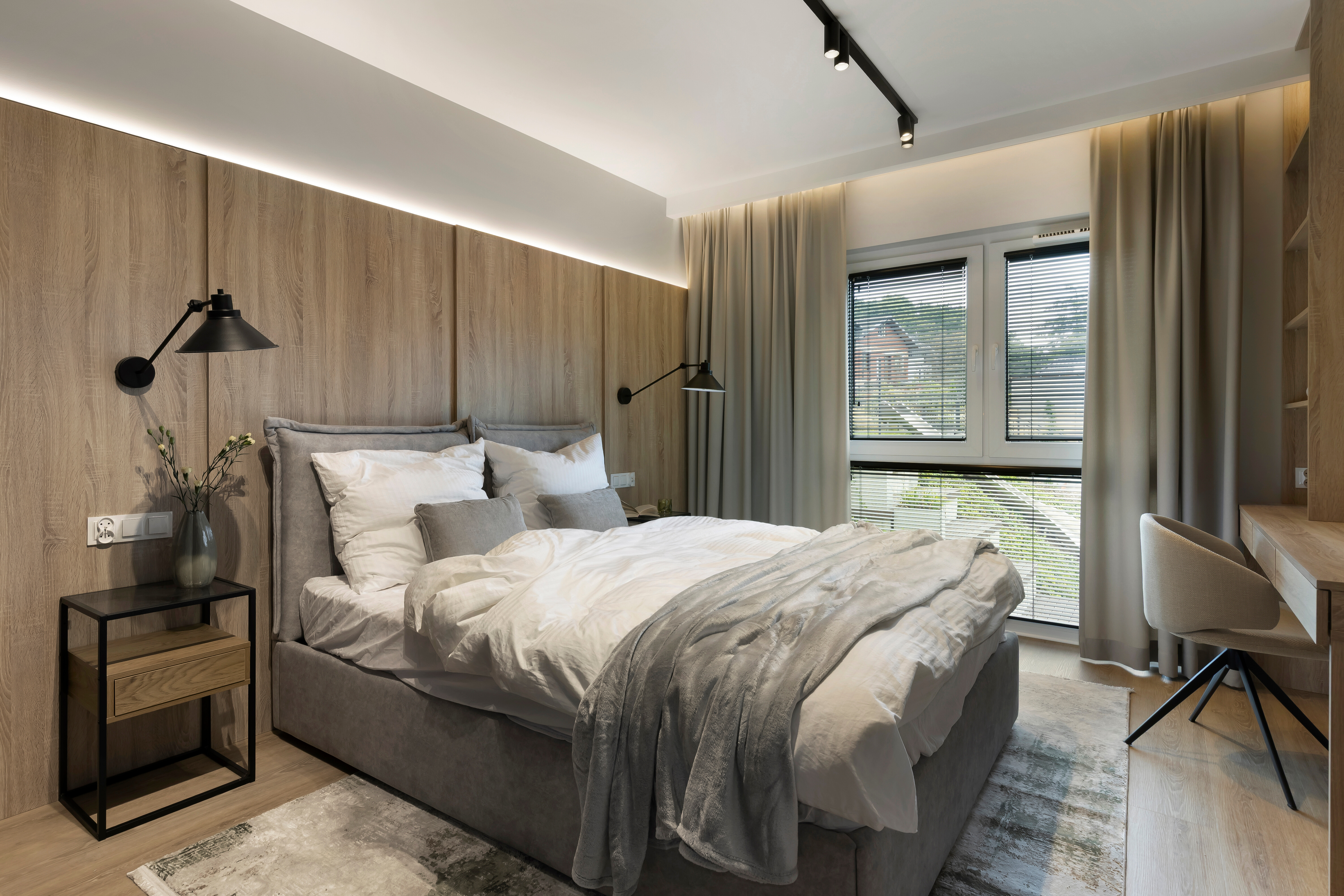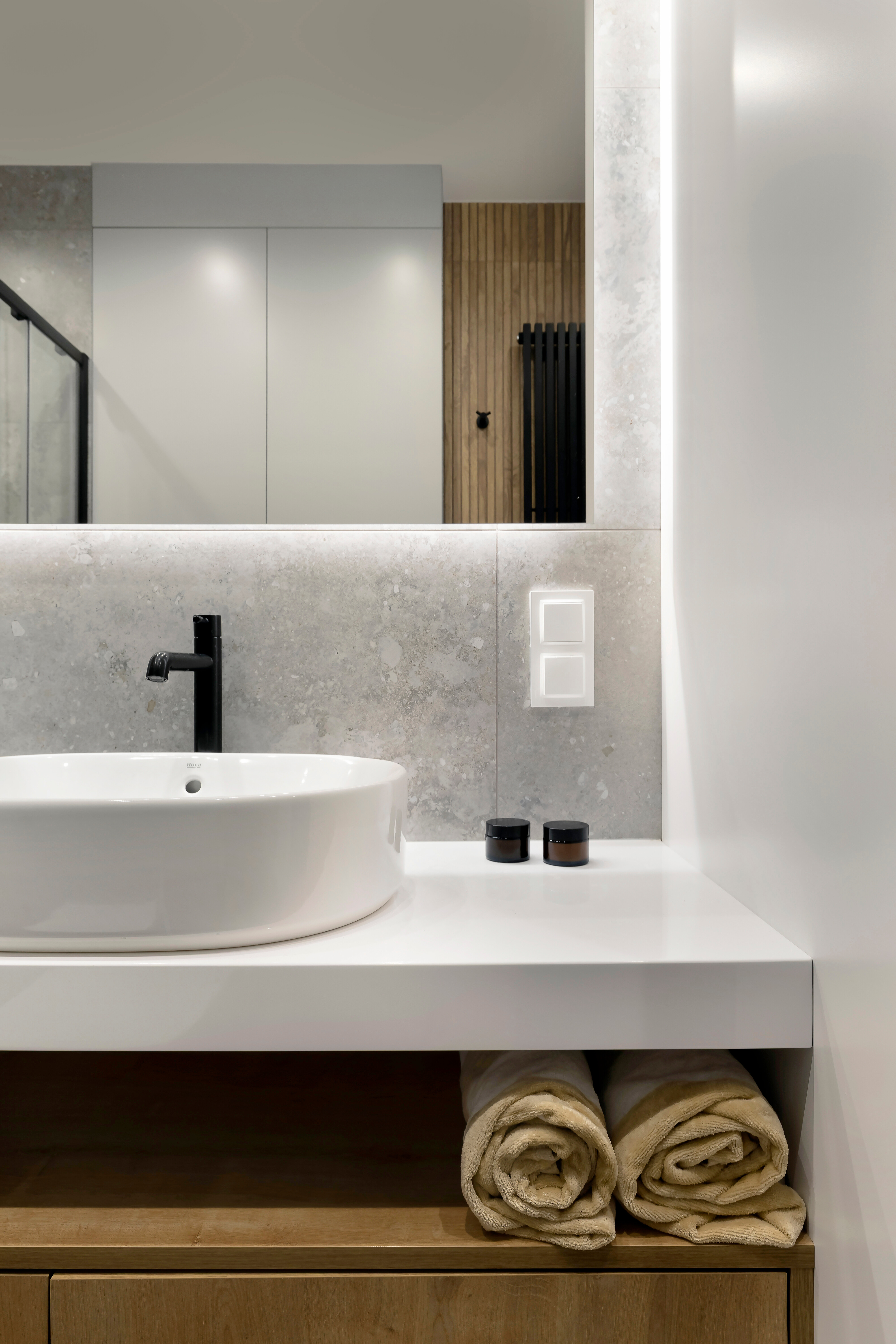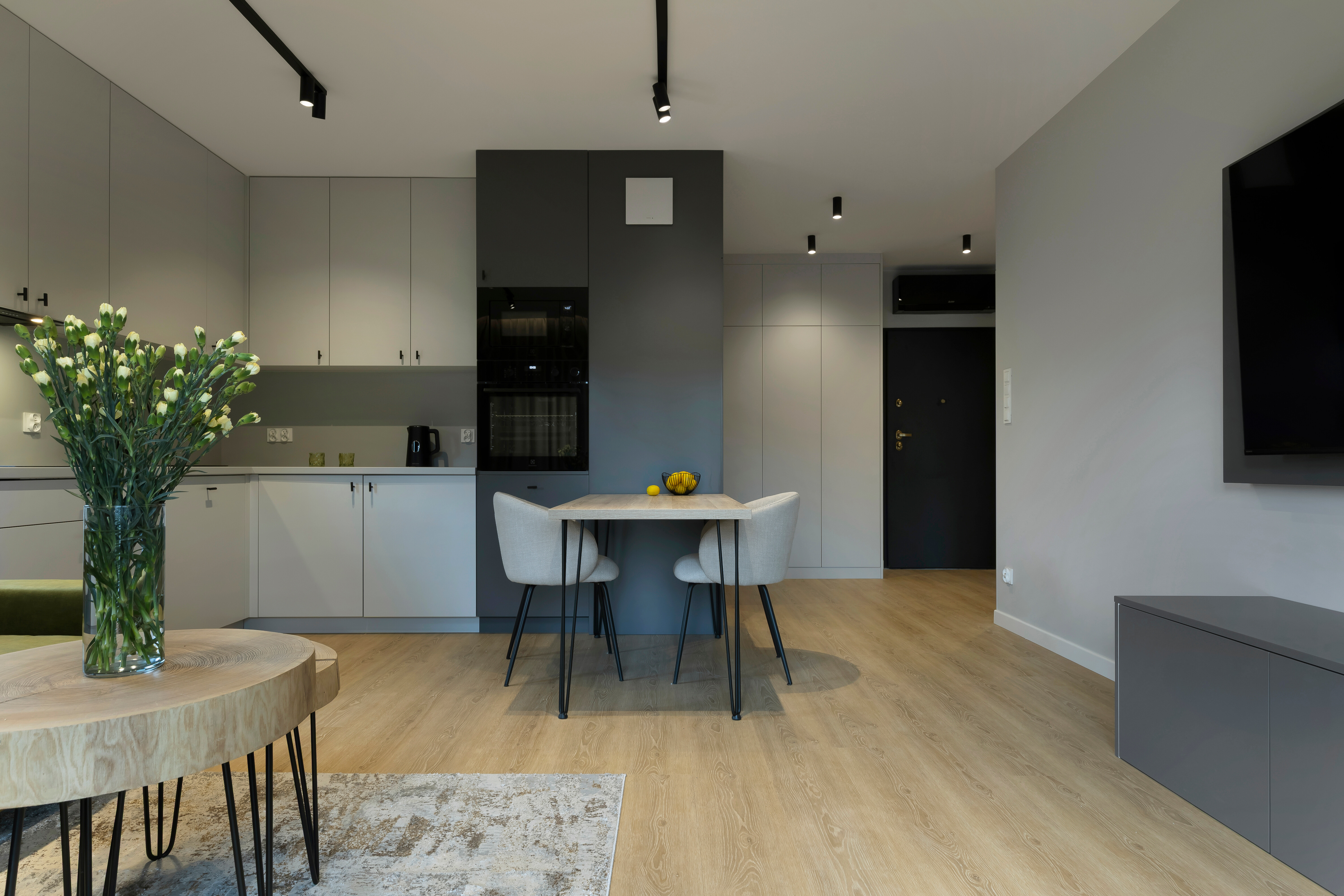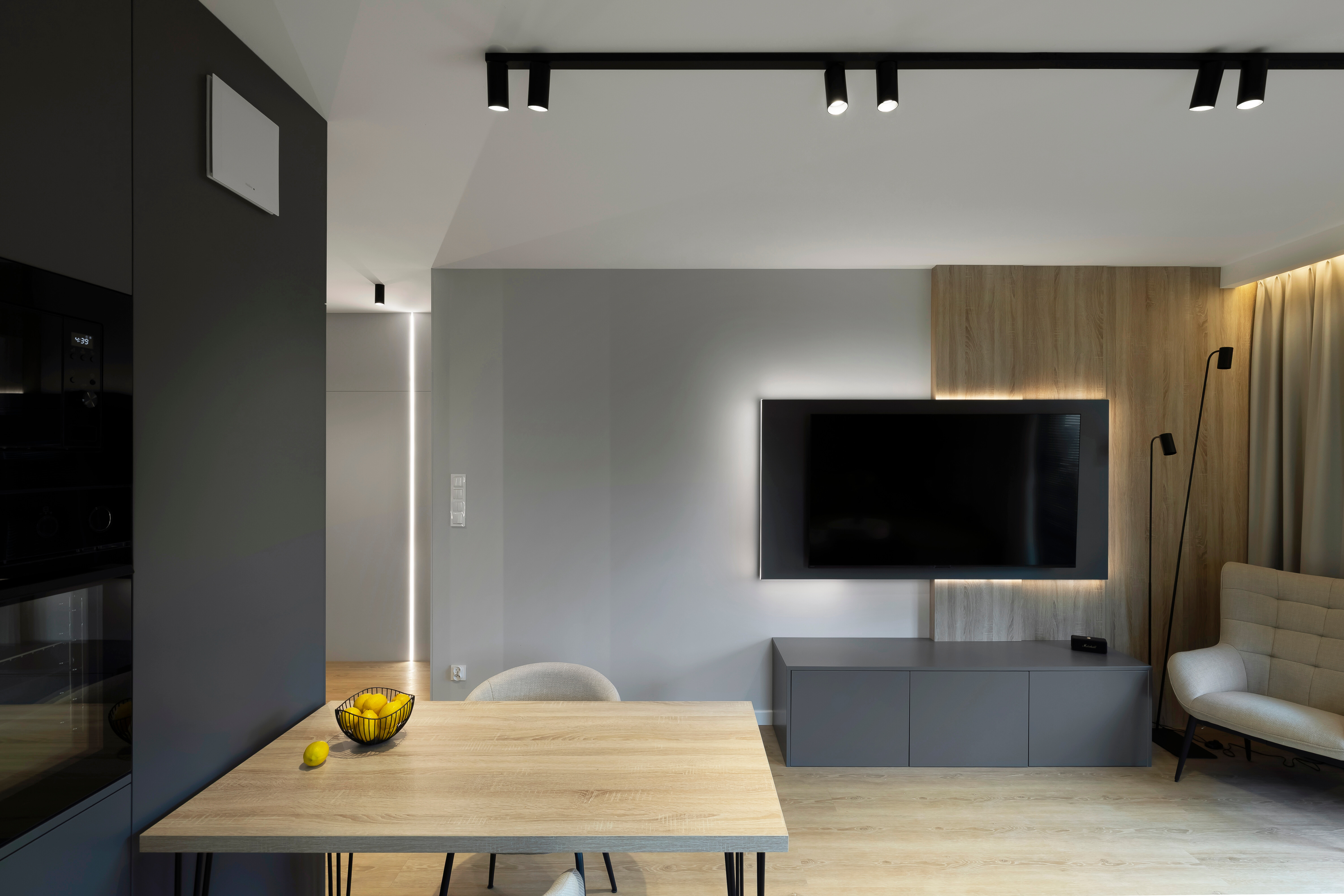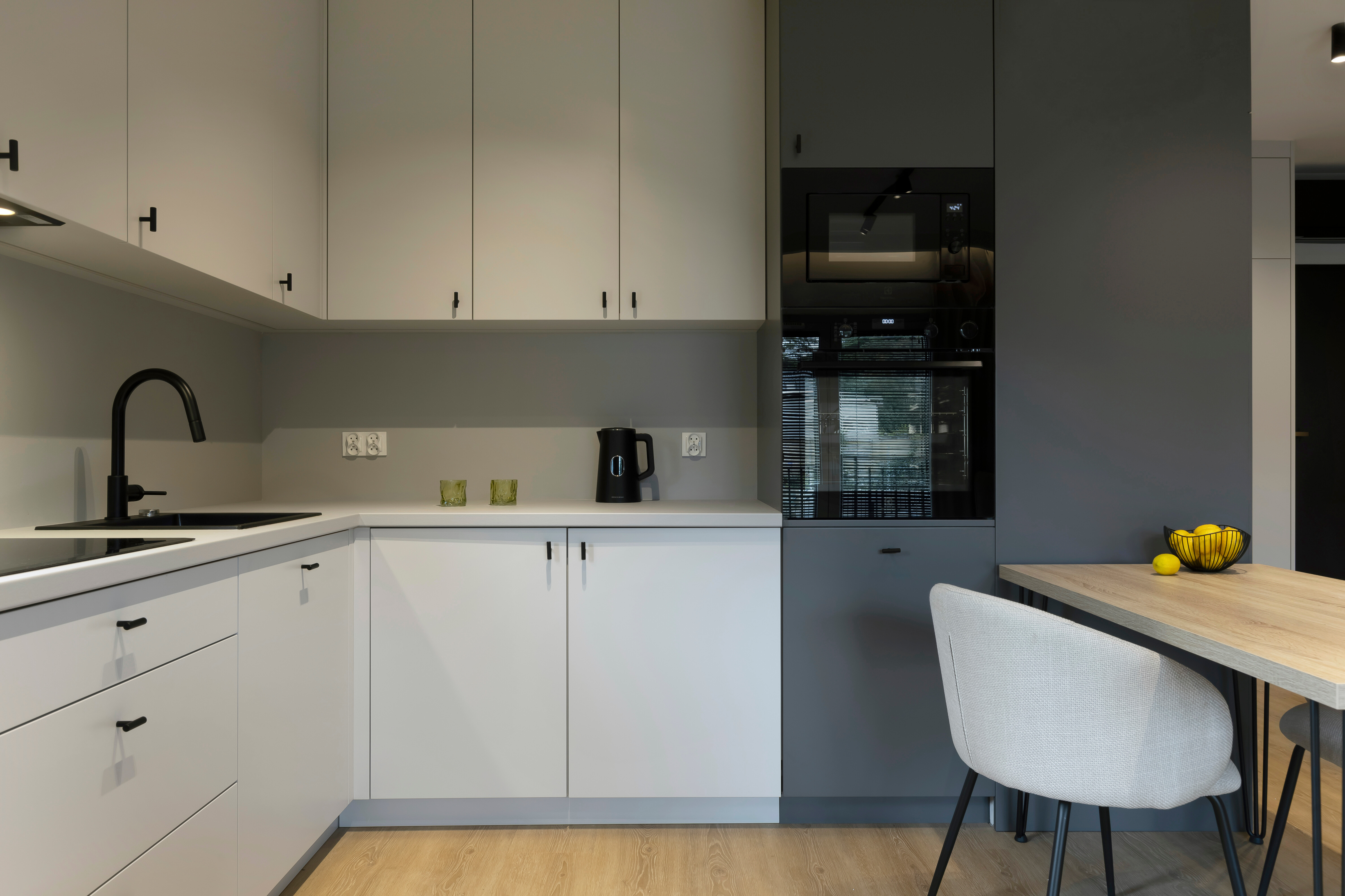 To już piąty projekt dla tych samych Inwestorów! Piąty, z czego każdy był w zupełnie innym stylu... :) Tu postawiliśmy na nowoczesność, ale także przytulność. Całe wnętrze jest monochromatyczne i utrzymane w stonowanych barwach: bieli, szarości, czerni, delikatnych beżów. Pojawia się tu jednak swoisty akcent, jakim jest... oliwkowa kanapa! Taka kolorystyka była marzeniem Inwestorki, które w końcu udało nam się spełnić. Jako, że jest ona dość mocnym elementem,