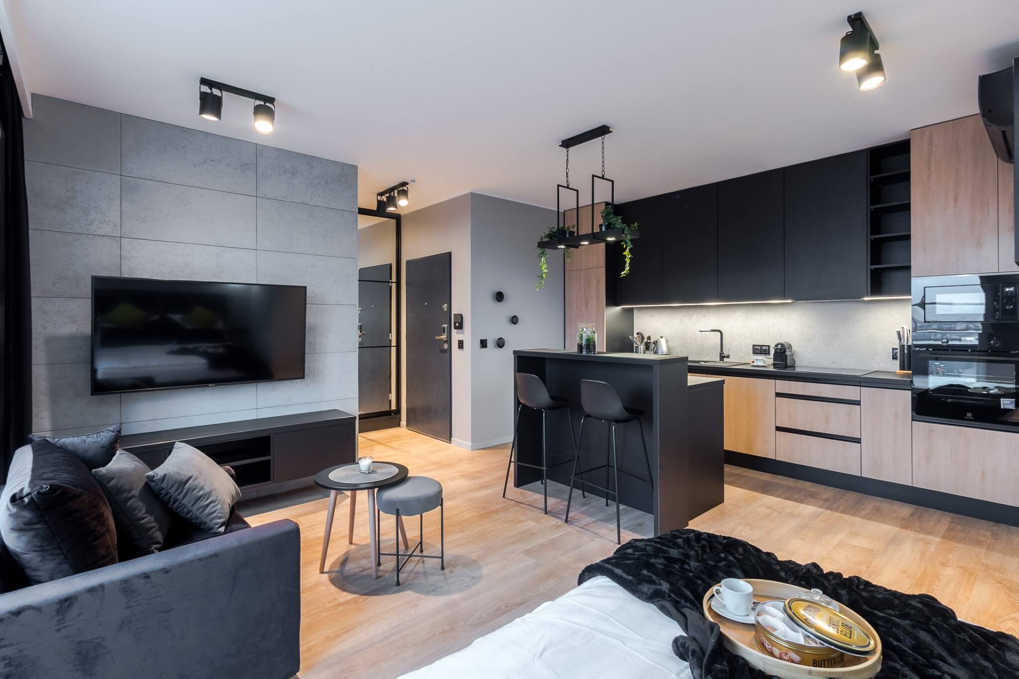 Projekt aranżacji wnętrza mieszkania 1-pokojowego przeznaczonego pod wynajem krótkoterminowy w Atal Baltica Towers w Gdańsku Brzeźnie. Niewielki metraż samego mieszkania zostaje zrekompensowany ponad 100-metrowym tarasem z widokiem na morze. W mieszkaniu dominuje połączenie drewna, czerni i betonu, które wizualnie ociepliliśmy kolorystyką zieleni i żółci. Wyposażenie tarasu, które także w znacznej mierze było zaprojektowane na wymiar, eksponuje jeszcze bardziej jego walory.