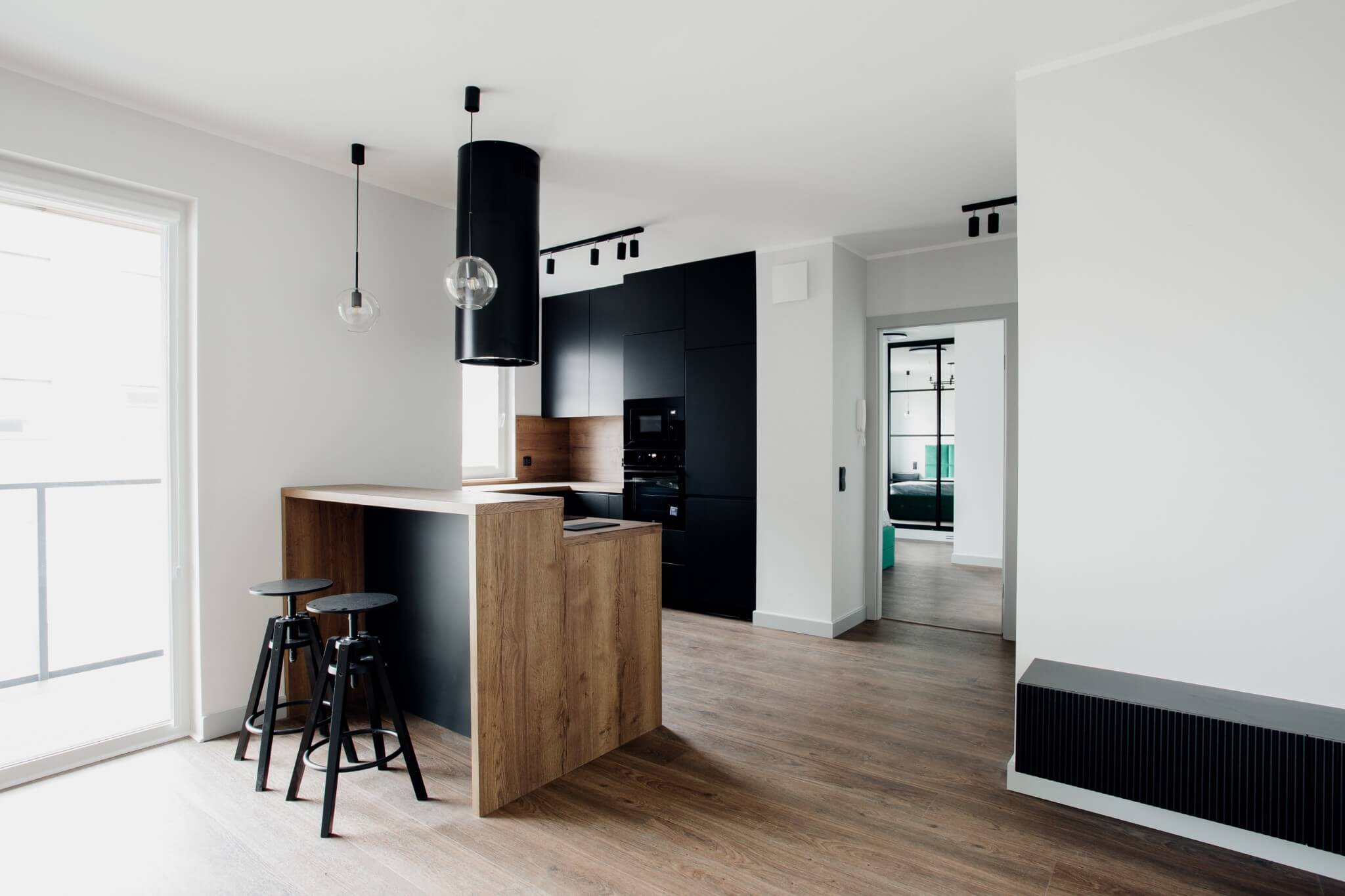 Projekt wnętrza mieszkania na gdańskim Jasieniu skierowany był do młodego mężczyzny, rozpoczynającego samodzielne życie. Dominuje tu ciemna kolorystyka - czerń z akcentami betonu i ciemnego drewna. Loftowe akcenty sprawiają, że wnętrze jest naprawdę ciekawe w odbiorze, a przede wszystkim - odpowiada gustowi jego mieszkańca.