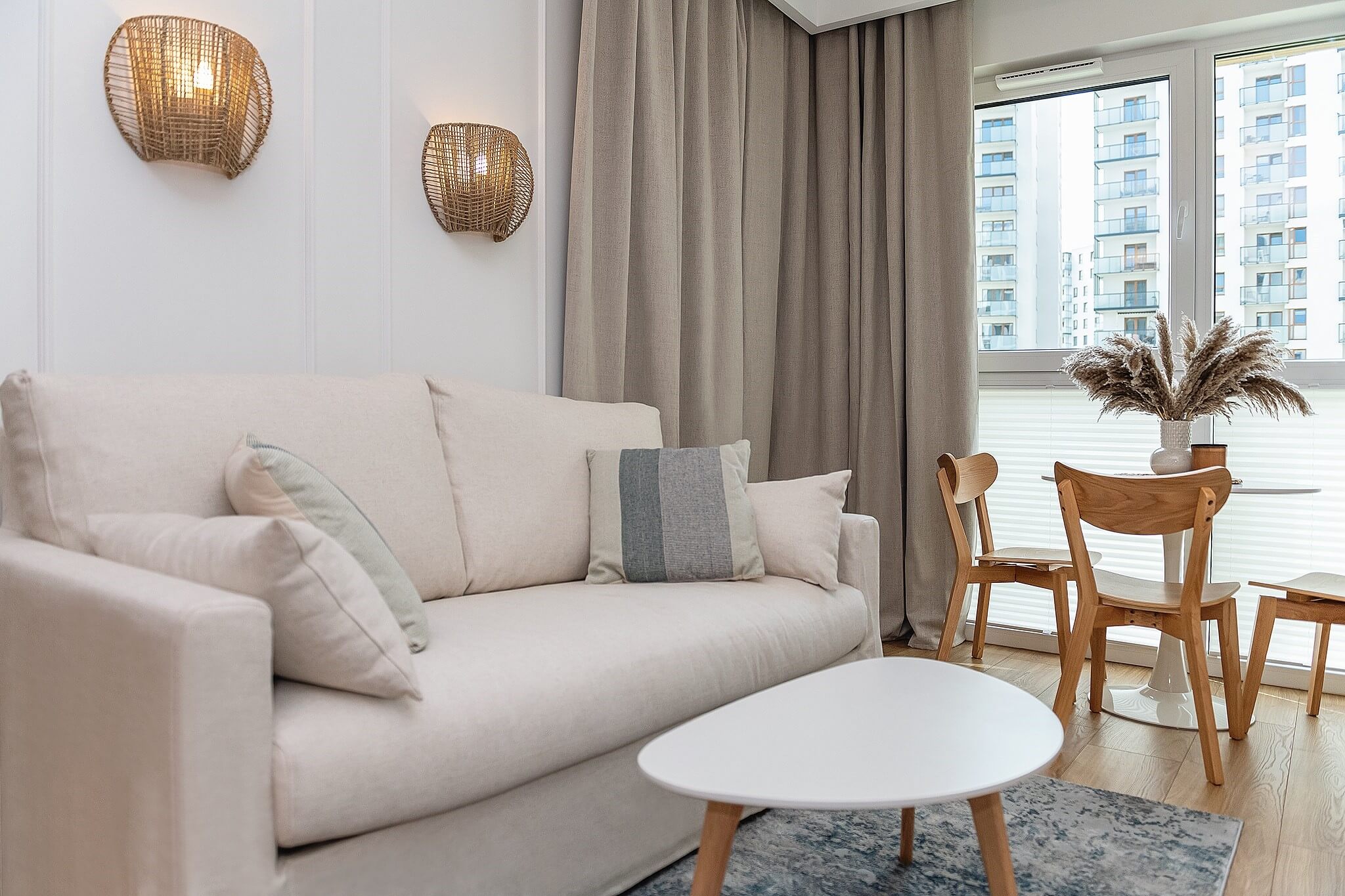 Niewielka kawalerka na gdańskiej Letnicy miała pełnić funkcję mieszkania wakacyjnego jego właścicielki. Mieliśmy tutaj do dyspozycji dość duży jak na mieszkanie jednopokojowe metraż, dlatego postanowiliśmy poprawić funkcjonalność względem tego, co zaproponował nam deweloper. W rezultacie powstała nam częściowo wydzielona sypialnia z pełnoprawnym, sypialnianym łóżkiem, salon, który pomieścił kanapę, stół i zabudowę RTV zintegrowaną z szafą, a także w pełni funkcjonalna kuchnia, łazienka i przedpokój z aż dwiema szafami! W tym mieszkanku panuje iście wakacyjny klimat, w którym przeplatają się elementy hampton i boho. Jasna kolorystyka połączona z odcieniem ciepłego, naturalnego drewna, akcenty błękitu (w końcu z Letnicy mamy 15 minut spacerkiem na plażę), a także elementy rattanu i trawy morskiej sprawiły, że już po przekroczeniu progu mieszkania zapominamy o troskach dnia codziennego, a skupiamy się na wypoczynku i relaksie.