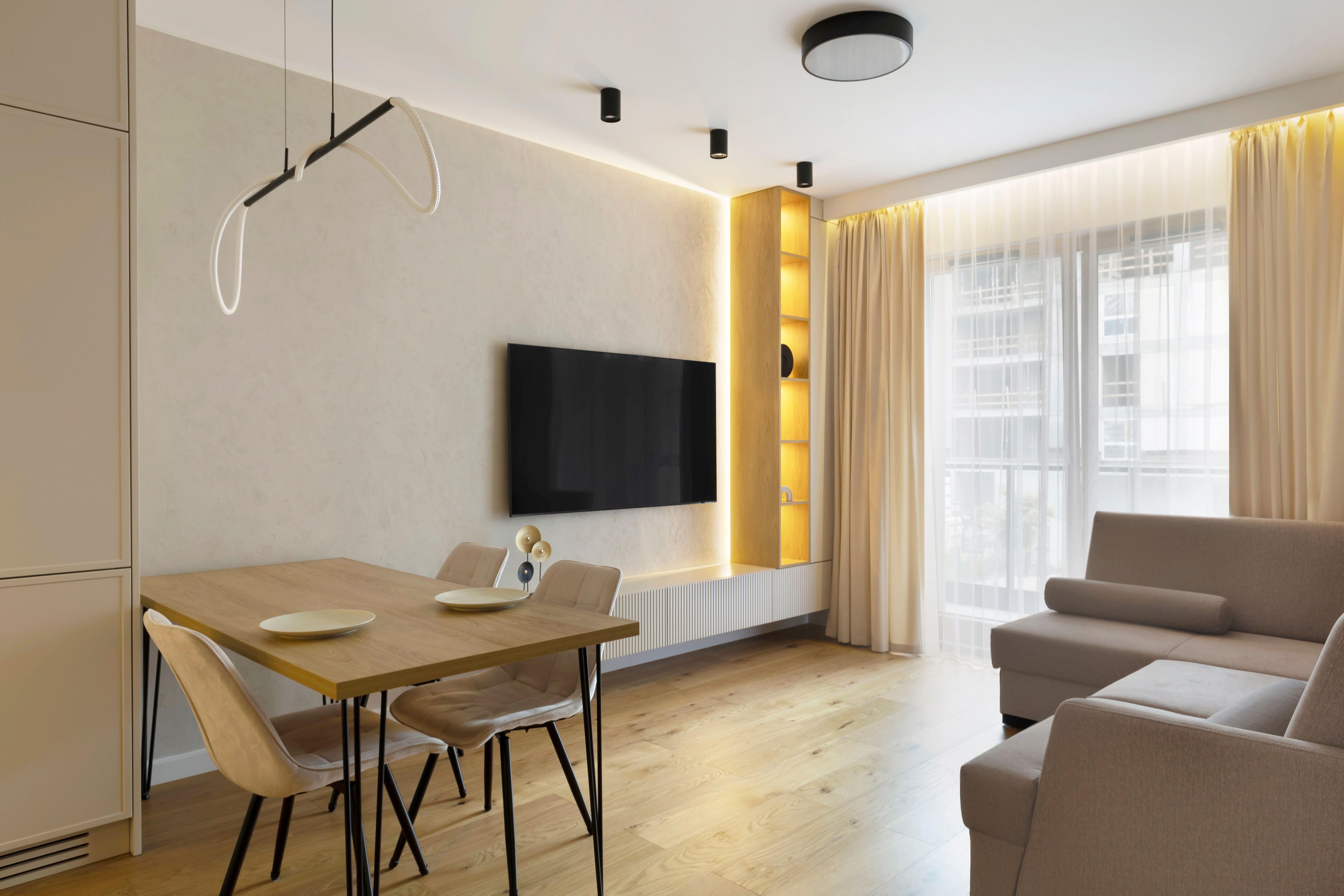 To mieszkanie zostało zaprojektowane jako mieszkanie wakacyjne (i nie tylko!) dla jego właścicieli, mieszkających poza Trójmiastem. Projekt aranżacji wnętrza zakładał zarówno zmiany aranżacyjne - tzn. korekty instalacyjne, jak i nieznaczne zmiany układu ścianek jak i pełną aranżację wnętrza. Właścicielom zależało na tym, aby stanowiło ono oazę spokoju, w której będą mogli wypocząć od zgiełku miasta. Ze względu na bliskość plaży, inspirowaliśmy się tutaj właśnie kolorystyką, jak i tematyką morską przedstawioną w dyskretny, stonowany sposób. Stąd królują tutaj beże, ciepłe światło, ale i delikatne akcenty błękitu. Zwróćcie uwagę na sypialnię - na tym stosunkowo niewielkim metrażu udało nam się zmieścić dwa oddzielne, pojedyncze łóżka, które w razie potrzeby, po zsunięciu tworzą łoże małżeńskie, dużą ilość miejsca do przechowywania dzięki obudowaniu łóżek zabudową stolarską, a także miejsce do pracy z wygodnym biurkiem i dodatkową półką na dokumenty. Dzięki temu świetnie nadaje się także do modnego dziś workation.