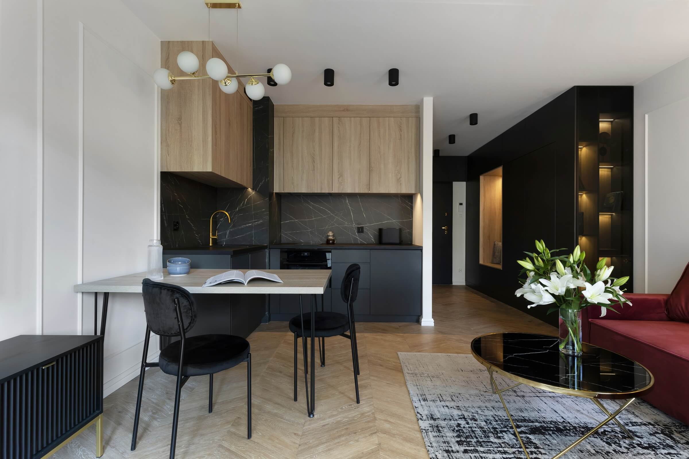 Mieszkanie pełne jest kontrastów - zastosowano tutaj klasyczne połączenie bieli i czerni, które nadają wnętrzu charakteru i tworzą elegancki klimat. Ocieplenie stanowi tutaj rozbielone drewno oraz złote dodatki. Jedynym akcentem kolorystycznym jest kanapa - prosta w formie, ale w odważnym, oryginalnym odcieniu.