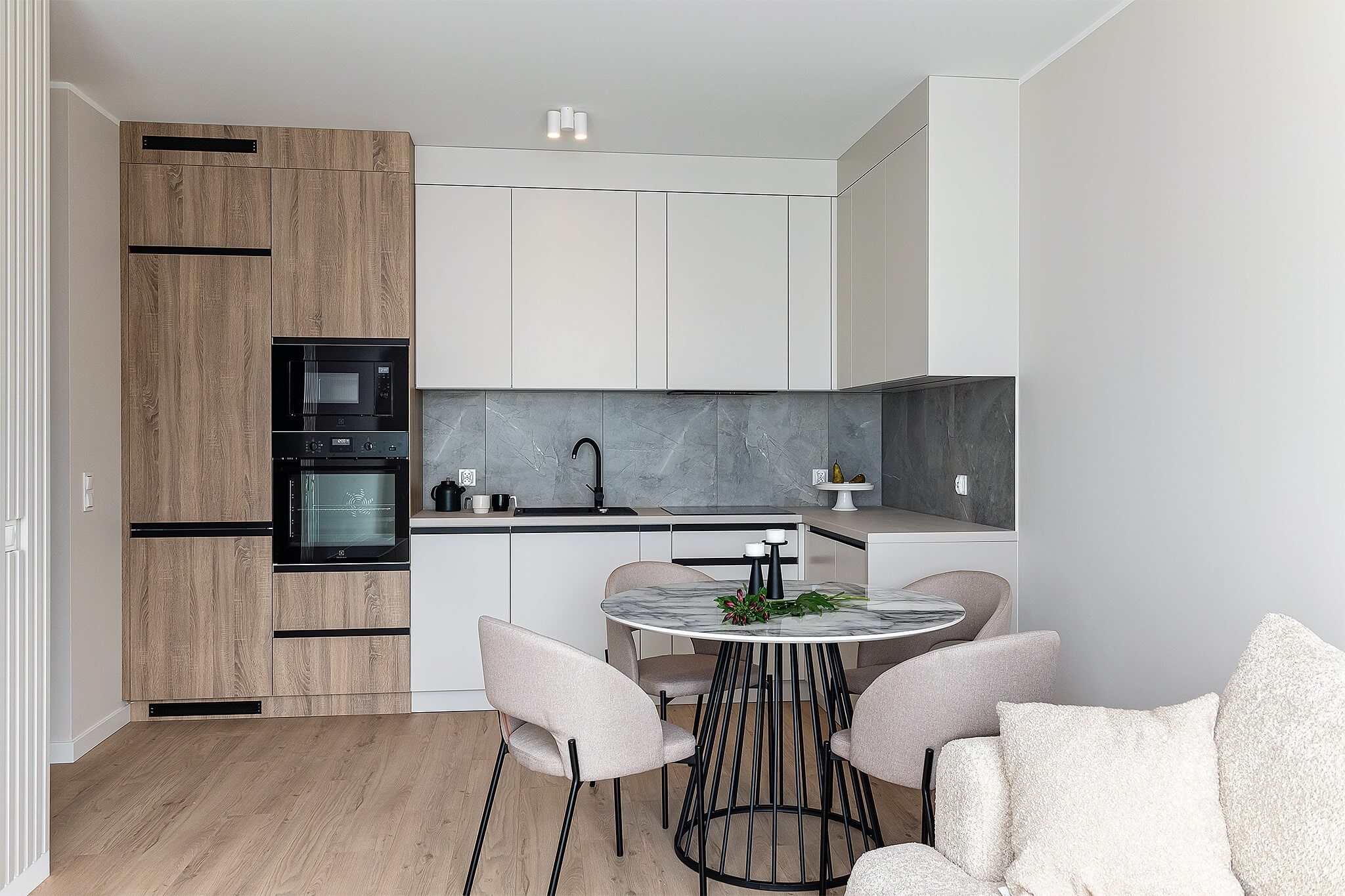 Projekt aranżacji wnętrza 2-pokojowego przeznaczonego dla młodej kobiety. Zaplanowane przez dewelopera pokoje były tu tak duże, że udało nam się wydzielić sporych rozmiarów garderobę, przy jednoczesnym zachowaniu pełnej funkcjonalności salonu i sypialni! Mieszkanie utrzymane jest w odcieniach kaszmiru, które podkręcone zostały za pomocą czarnych akcentów. Pojawia się tutaj także kilka typowo kobiecych dodatków, np. w postaci złotych lamp.